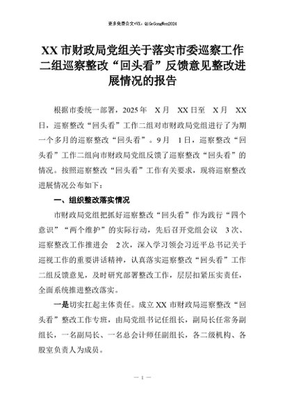 【七哥公文】2026年:XX市财政局党组关于落实市委巡察工作二组巡察整改“回头看”反馈意见整改进展情况的报告+更多免费公文+VX:QiGeGongWen2024