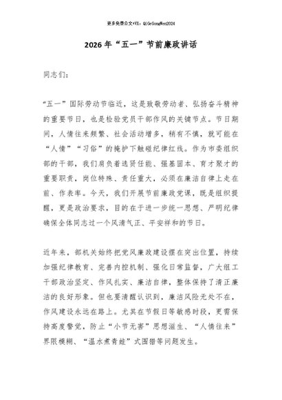 / 【七哥公文】2026年:2026年“五一”节前廉政讲话_副本+更多免费公文+VX:QiGeGongWen2024