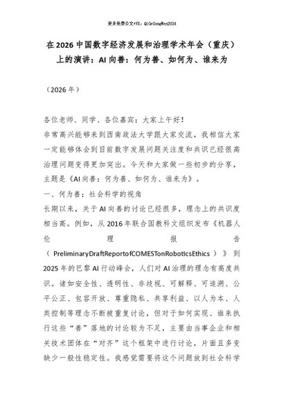 【七哥公文】2026年:在2026中国数字经济发展和治理学术年会(重庆)上的演讲:AI向善:何为善、如何为、谁来为_副本+更多免费公文+VX:QiGeGongWen2024