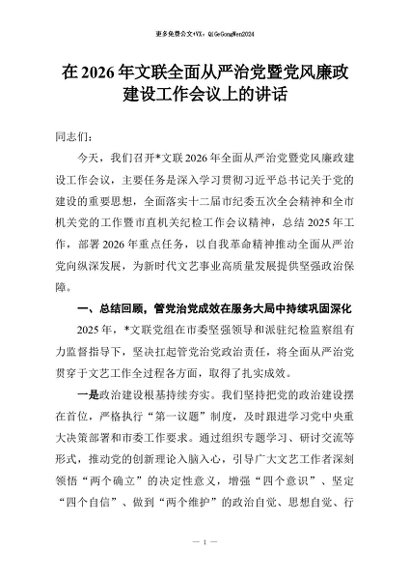 【七哥公文】2026年:在2026年文联全面从严治党暨党风廉政建设工作会议上的讲话+更多免费公文+VX:QiGeGongWen2024