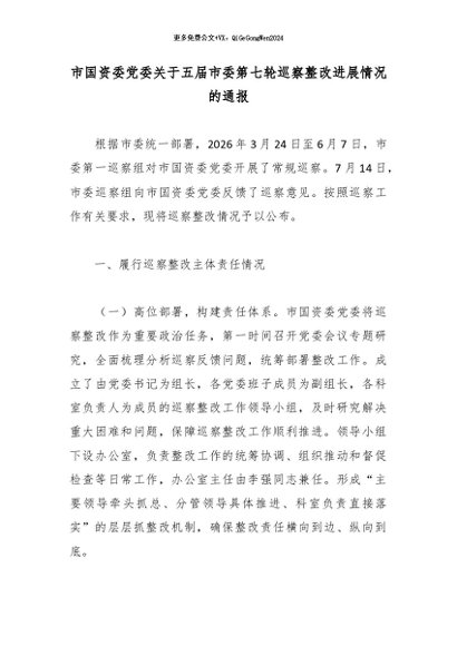 【七哥公文】2026年:市国资委党委关于五届市委第七轮巡察整改进展情况的通报_副本+更多免费公文+VX:QiGeGongWen2024