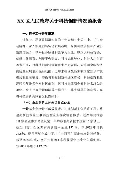 / 【七哥公文】2026年:XX区人民政府关于科技创新情况的报告+更多免费公文+VX:QiGeGongWen2024