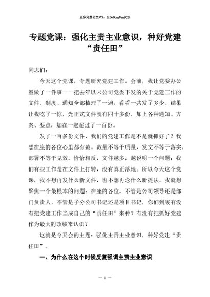 / 【七哥公文】2026年:专题党课:强化主责主业意识,种好党建“责任田”+更多免费公文+VX:QiGeGongWen2024
