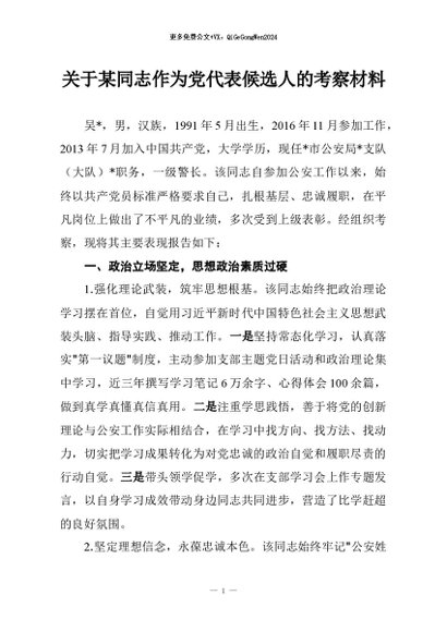 / 【七哥公文】2026年:关于某同志作为党代表候选人的考察材料+更多免费公文+VX:QiGeGongWen2024