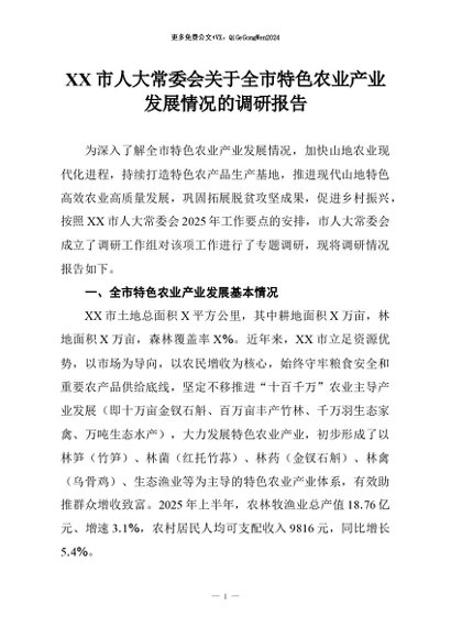【七哥公文】2026年:XX市人大常委会关于全市特色农业产业发展情况的调研报告+更多免费公文+VX:QiGeGongWen2024