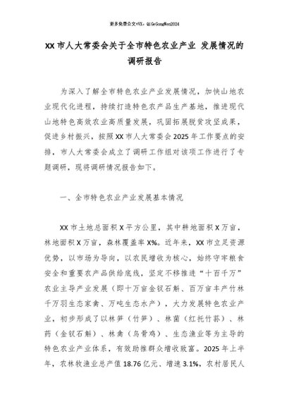 【七哥公文】2026年:XX市人大常委会关于全市特色农业产业 发展情况的调研报告_副本+更多免费公文+VX:QiGeGongWen2024