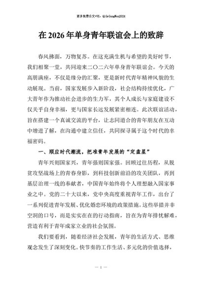 / 【七哥公文】2026年:在2026年单身青年联谊会上的致辞+更多免费公文+VX:QiGeGongWen2024