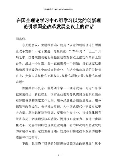【七哥公文】2026年:在国企理论学习中心组学习以党的创新理论引领国企改革发展会议上的讲话+更多免费公文+VX:QiGeGongWen2024