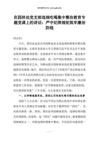 【七哥公文】2026年:在园林处党支部违规吃喝集中整治教育专题党课上的讲话:严守纪律规矩筑牢廉洁防线+更多免费公文+VX:QiGeGongWen2024