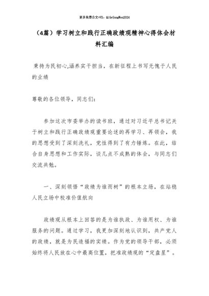 【七哥公文】2026年:(4篇)学习树立和践行正确政绩观精神心得体会材料汇编+更多免费公文+VX:QiGeGongWen2024