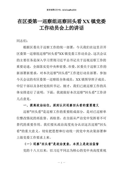 【七哥公文】2026年:在区委第一巡察组巡察回头看XX镇党委工作动员会上的讲话+更多免费公文+VX:QiGeGongWen2024