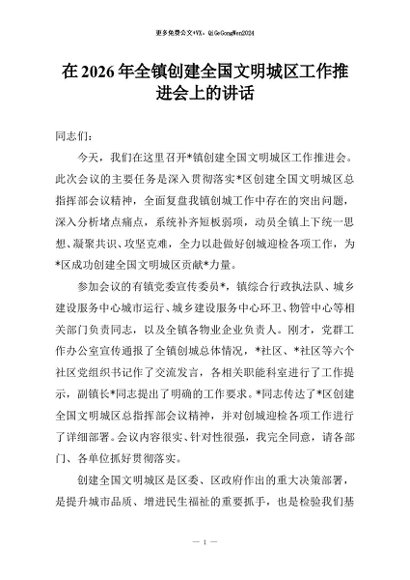 【七哥公文】2026年:在2026年全镇创建全国文明城区工作推进会上的讲话+更多免费公文+VX:QiGeGongWen2024