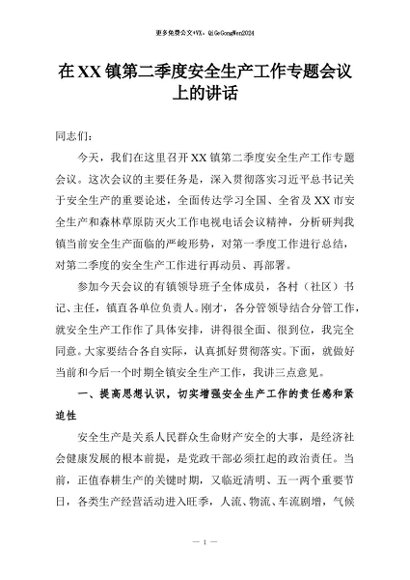 / 【七哥公文】2026年:在XX镇第二季度安全生产工作专题会议上的讲话+更多免费公文+VX:QiGeGongWen2024