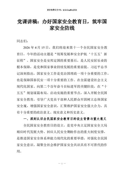 / 【七哥公文】2026年:党课讲稿:办好国家安全教育日,筑牢国家安全防线+更多免费公文+VX:QiGeGongWen2024