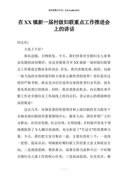 / 【七哥公文】2026年:在XX镇新一届村级妇联重点工作推进会上的讲话+更多免费公文+VX:QiGeGongWen2024