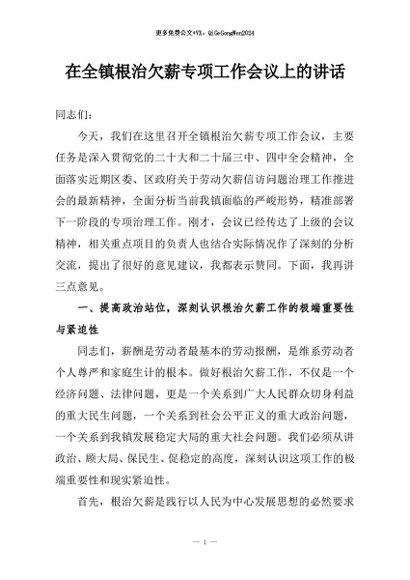 / 【七哥公文】2026年:在全镇根治欠薪专项工作会议上的讲话+更多免费公文+VX:QiGeGongWen2024