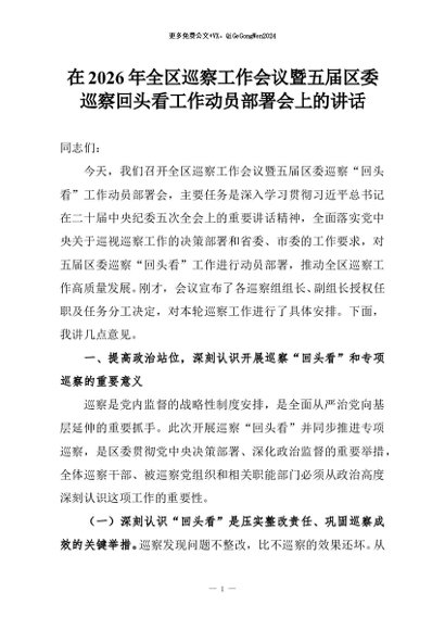 【七哥公文】2026年:在2026年全区巡察工作会议暨五届区委巡察回头看工作动员部署会上的讲话+更多免费公文+VX:QiGeGongWen2024