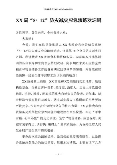 【七哥公文】2026年:XX局“5・12”防灾减灾应急演练欢迎词+更多免费公文+VX:QiGeGongWen2024