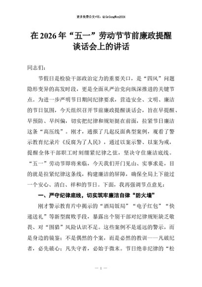 【七哥公文】2026年:在2026年“五一”劳动节节前廉政提醒谈话会上的讲话+更多免费公文+VX:QiGeGongWen2024
