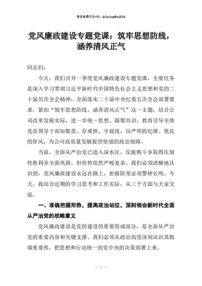 【七哥公文】2026年:党风廉政建设专题党课:筑牢思想防线,涵养清风正气+更多免费公文+VX:QiGeGongWen2024