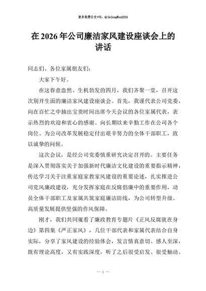 / 【七哥公文】2026年:在2026年公司廉洁家风建设座谈会上的讲话+更多免费公文+VX:QiGeGongWen2024