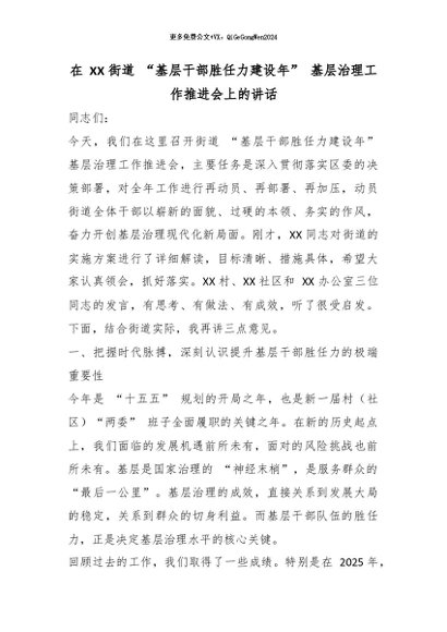 【七哥公文】2026年:在 XX 街道 “基层干部胜任力建设年” 基层治理工作推进会上的讲话_副本+更多免费公文+VX:QiGeGongWen2024