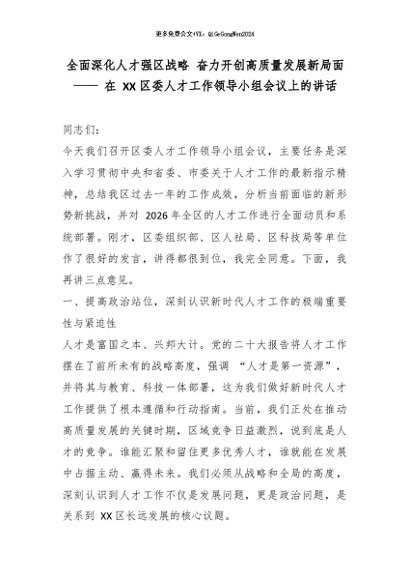 【七哥公文】2026年:全面深化人才强区战略 奋力开创高质量发展新局面—— 在 XX 区委人才工作领导小组会议上的讲话_副本+更多免费公文+VX:QiGeGongWen2024
