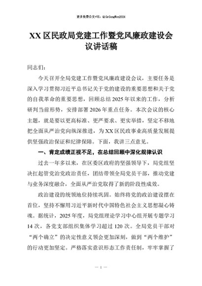 / 【七哥公文】2026年:XX区民政局党建工作暨党风廉政建设会议讲话稿+更多免费公文+VX:QiGeGongWen2024