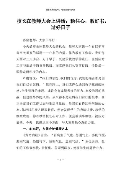 / 【七哥公文】2025年:校长在教师大会上讲话:稳住心,教好书,过好日子+更多免费公文+VX:QiGeGongWen2024