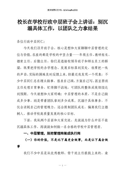 【七哥公文】2025年:校长在学校行政中层班子会上讲话:别沉溺具体工作,以团队之力拿结果+更多免费公文+VX:QiGeGongWen2024