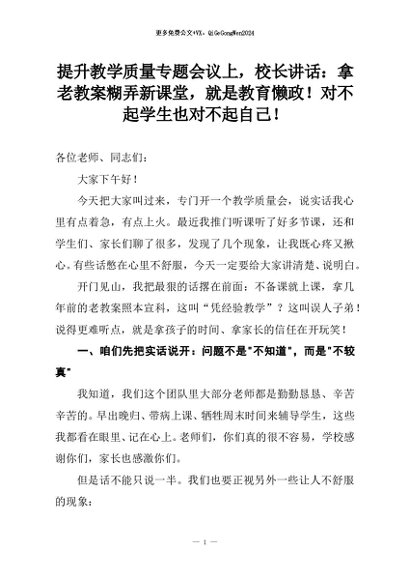 【七哥公文】2025年:提升教学质量专题会议上,校长讲话:拿老教案糊弄新课堂,就是教育懒政!对不起学生也对不起自己!+更多免费公文+VX:QiGeGongWen2024
