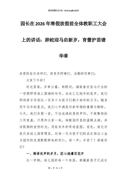 【七哥公文】2025年:园长在2026年寒假放假前全体教职工大会上的讲话:辞蛇迎马启新岁,育蕾护苗谱华章+更多免费公文+VX:QiGeGongWen2024