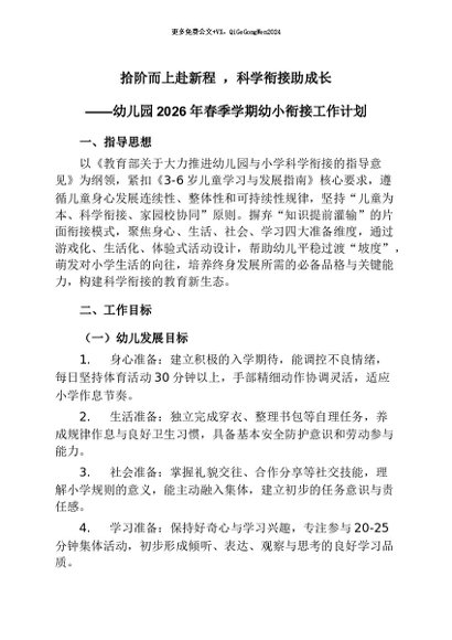 【七哥公文】2025年:幼儿园2026年春季学期幼小衔接工作计划:拾阶而上赴新程 ,科学衔接助成长+更多免费公文+VX:QiGeGongWen2024