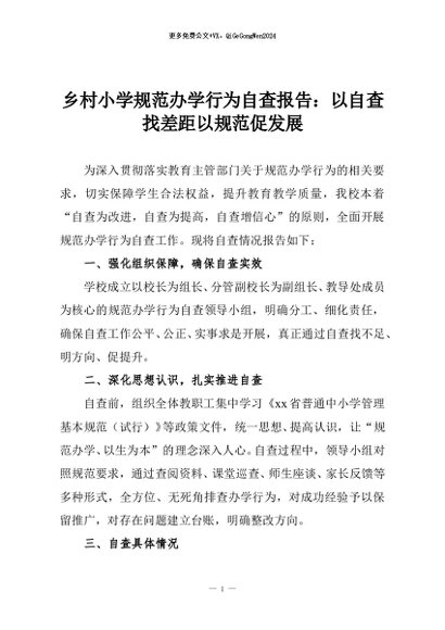 【七哥公文】2025年:乡村小学规范办学行为自查报告:以自查找差距以规范促发展+更多免费公文+VX:QiGeGongWen2024