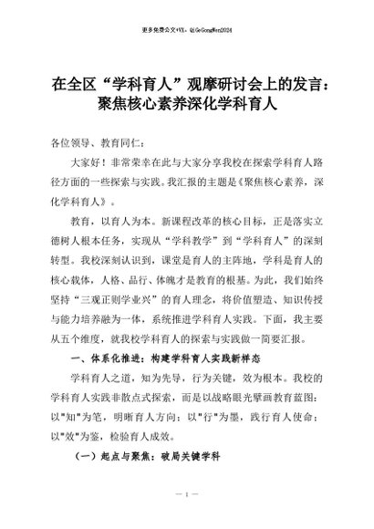 【七哥公文】2025年:在全区“学科育人”观摩研讨会上的发言:聚焦核心素养深化学科育人+更多免费公文+VX:QiGeGongWen2024