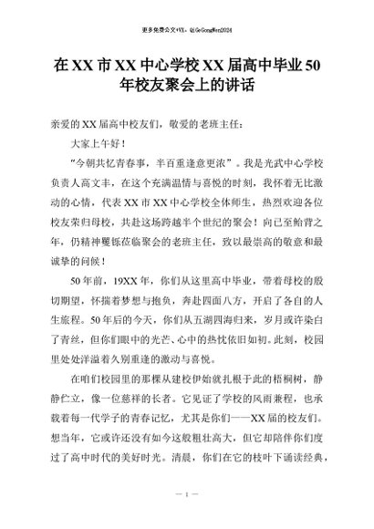 【七哥公文】2025年:在XX市XX中心学校XX届高中毕业50年校友聚会上的讲话+更多免费公文+VX:QiGeGongWen2024