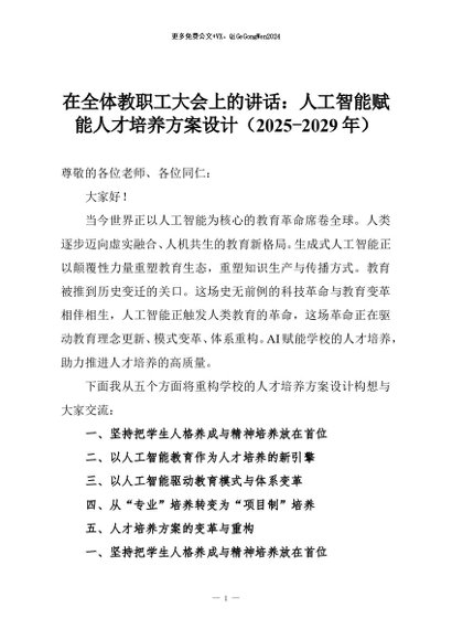 【七哥公文】2025年:在全体教职工大会上的讲话:人工智能赋能人才培养方案设计(2025-2029年)+更多免费公文+VX:QiGeGongWen2024