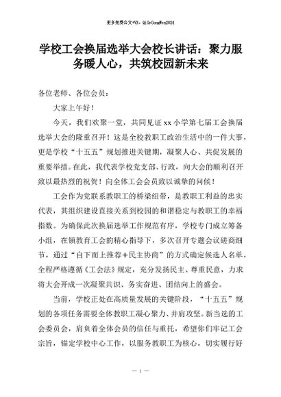 【七哥公文】2025年:学校工会换届选举大会校长讲话:聚力服务暖人心,共筑校园新未来+更多免费公文+VX:QiGeGongWen2024
