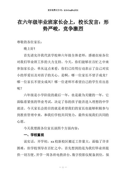 【七哥公文】2025年:在六年级毕业班家长会上,校长发言:形势严峻,竞争激烈+更多免费公文+VX:QiGeGongWen2024