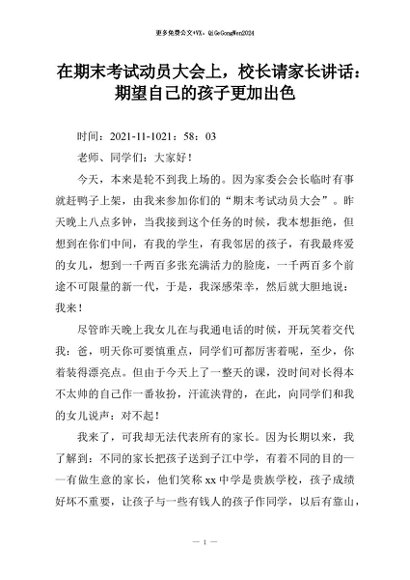 【七哥公文】2025年:在期末考试动员大会上,校长请家长讲话:期望自己的孩子更加出色+更多免费公文+VX:QiGeGongWen2024