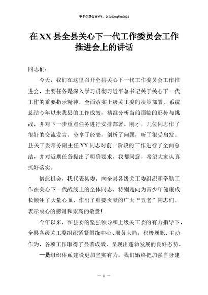 / 【七哥公文】2025年:在XX县全县关心下一代工作委员会工作推进会上的讲话+更多免费公文+VX:QiGeGongWen2024