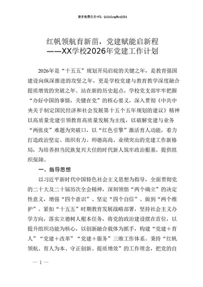 【七哥公文】2025年:XX学校2026年党建工作计划:红帆领航育新苗,党建赋能启新程+更多免费公文+VX:QiGeGongWen2024