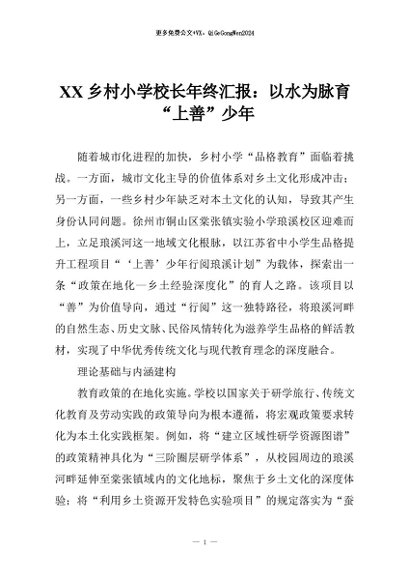 / 【七哥公文】2025年:XX乡村小学校长年终汇报:以水为脉育“上善”少年+更多免费公文+VX:QiGeGongWen2024