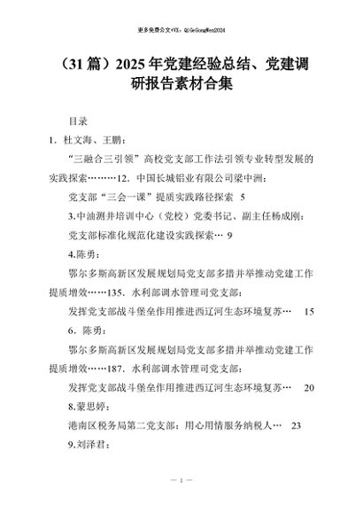【七哥公文】2025年:(31篇)2025年党建经验总结、党建调研报告素材合集+更多免费公文+VX:QiGeGongWen2024