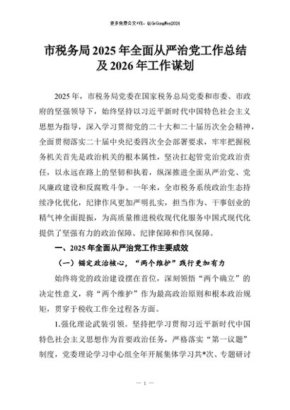 【七哥公文】2025年:市税务局2025年全面从严治党工作总结及2026年工作谋划+更多免费公文+VX:QiGeGongWen2024