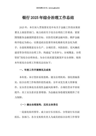 / 【七哥公文】2025年:银行2025年综合治理工作总结+更多免费公文+VX:QiGeGongWen2024