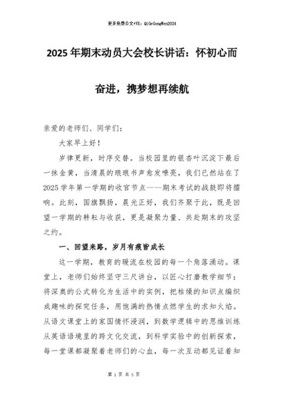 【七哥公文】2025年:2025年期末动员大会校长讲话:怀初心而奋进,携梦想再续航+更多免费公文+VX:QiGeGongWen2024