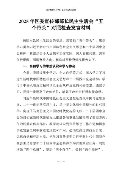 【七哥公文】2025年:2025年区委宣传部部长民主生活会“五个带头”对照检查发言材料+更多免费公文+VX:QiGeGongWen2024