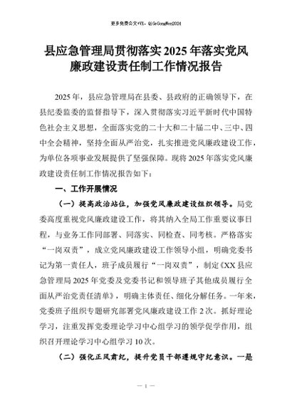 【七哥公文】2025年:县应急管理局贯彻落实2025年落实党风廉政建设责任制工作情况报告+更多免费公文+VX:QiGeGongWen2024