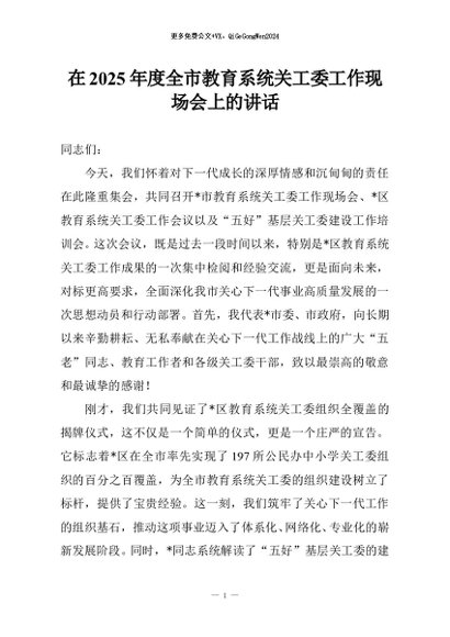 【七哥公文】2025年:在2025年度全市教育系统关工委工作现场会上的讲话+更多免费公文+VX:QiGeGongWen2024